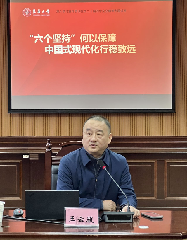 为持续深入学习领会、全面准确把握党的二十届四中全会的重大意义、精神实质和实践要求,2025年12月18日,人文学院举行学习贯彻党的二十届四中全会精神专题辅导报告会。学习贯彻党的二十届四中全会精神宣讲团成员、学校原党委副书记、纪委书记王云骏教授应邀作题为《“六个坚持”何以保障中国式现代化行稳致远》的辅导报告。人文学院党政班子成员、全体师生党员参加学习,报告会由人文学院院长张科静主持。