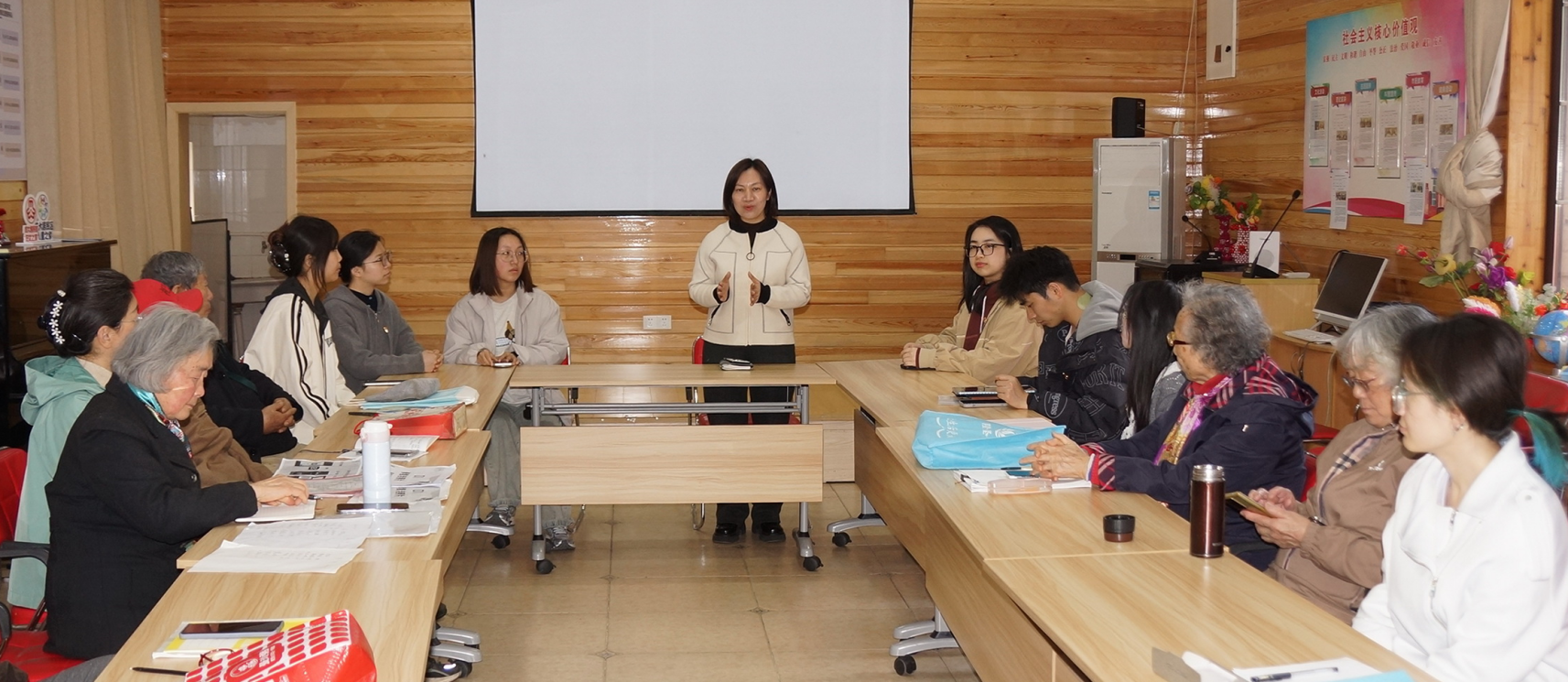 活动伊始,东华大学退管办主任邱登梅老师介绍了本次“乐龄相伴”活动的初衷。其表示,随着学校退休教职工高龄群体的增长,如何开展精准化的助老服务,成为一项亟待回应的课题。“乐龄相伴”项目由退管办于2025年发起,先行在人文学院试点推进,旨在依托优质的师生志愿服务资源,围绕高龄教师的实际需要,探索系统化的制度设计,提供丰富、人本的“陪伴服务菜单”,既满足对老同志的关怀需求,又助力青年师生在志愿服务中成长。其对学思先锋党支部需求牵引,拓展项目内涵,用专业和爱心陪伴高龄教师跨越“数字鸿沟”表示感谢,对退休前辈们“与时俱进、终身学习”的精气神表示敬意,衷心祝福“老”与“少”在跨越年龄的温暖相伴中都能收获成长与快乐。